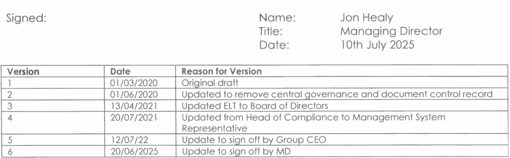 This Policy is reviewed to ensure its ongoing suitability by the Board of Directors and Management System Representative, who recommend amendments and updates to the Policy as part of the continual service improvement process.
